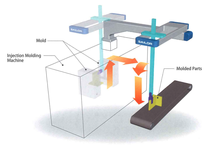 Sailor developed light weight robust robots (including a carbon fibre range) with a unique ‘harmonic curves’ in its stroke as well as a picking a placing conveyor system and automation lines to halve take out time, reduce breakdown to years and keep parts consistent to reduce rejects, often resulting in production lines with double the parts per month compared to standard setups.